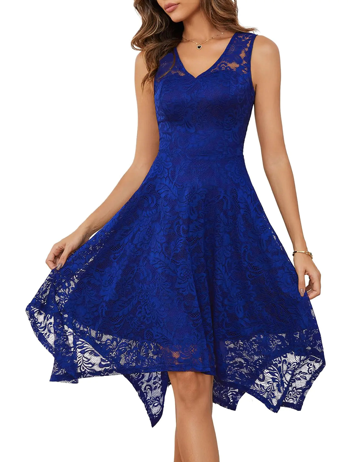 Meetjen Wedding Guest Dress Lace Bridesmaid Dress V-Neck Cocktail Dresses Handkerchief Hem Fancy Dress RoyalBlue 3XL