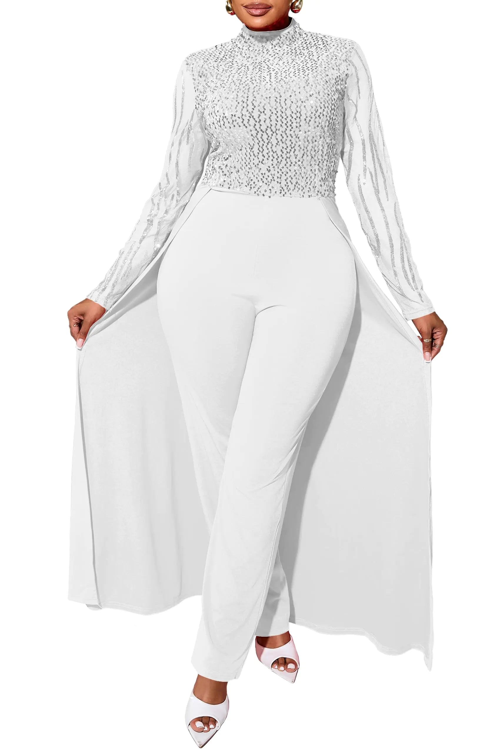 VERWIN Plus Size Sequins Jumpsuit for Women Patchwork Overlay Full Length Womens Jumpsuit High-Waist Woman Romper 5XL White